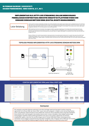 M Firman, Raiwan (2024) IMPLEMENTASI HLS (HTTP LIVE STREAMING) DALAM MENGURANGI PEMBAJAKAN KONTEN PADA INDUSTRI KREATIF DI PLATFORM VIDEO ON-DEMAND DENGAN METODE DRM (DIGITAL RIGHTS MANAGEMENT). Other thesis, Politenkik Caltex Riau.
