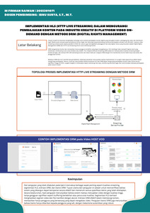 Industri kreatif di Indonesia menghadapi tantangan serius terkait pembajakan konten digital, yang merugikan kreator, pemegang hak cipta, dan distributor legal. Teknologi HTTP Live Streaming (HLS) dan Digital Rights Management (DRM) diusulkan sebagai solusi untuk melindungi konten digital. HLS memungkinkan pengiriman konten video secara adaptif, sementara DRM memberikan kontrol atas akses dan distribusi konten. Penelitian ini bertujuan untuk mengimplementasikan DRM pada HLS untuk meningkatkan perlindungan konten digital. Metodologi penelitian meliputi studi literatur, perencanaan, implementasi, dan evaluasi. Hasil pengujian menunjukkan bahwa kombinasi HLS dan DRM efektif dalam mengurangi pembajakan konten digital, meningkatkan keamanan, dan memberikan pengalaman pengguna yang lebih baik.